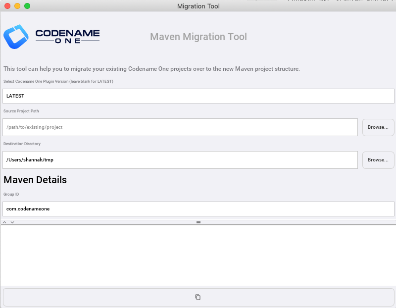 The Maven migration tool is a GUI application that converts Codename One ANT-based projects into Maven projects.