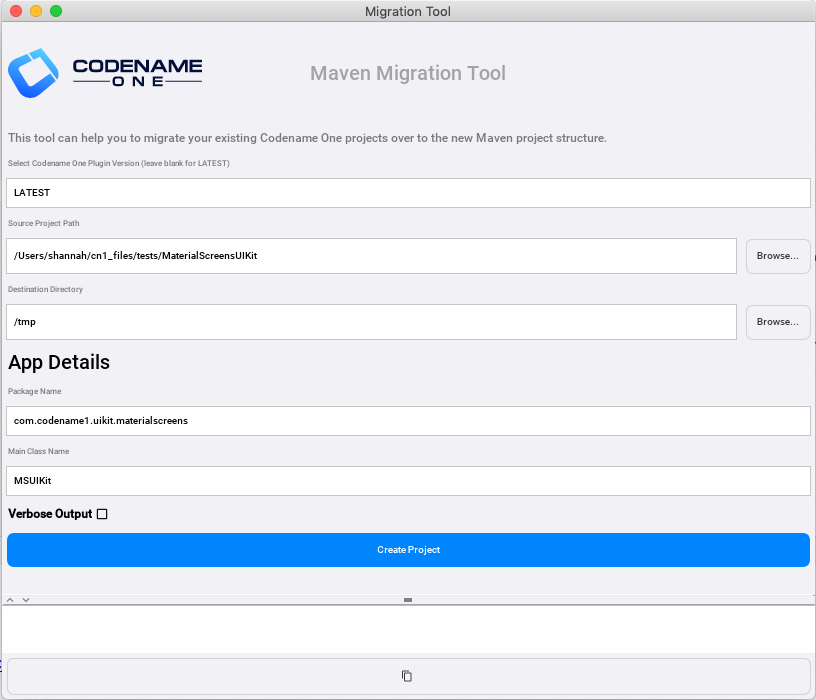 After you have selected this project, the migration tool form should be updated to reveal fields to edit the “Main Class Name”, and “Package Name”. They will be pre-populated with the original values from the project you are migrating, but you can change these values as appropriate for your application.