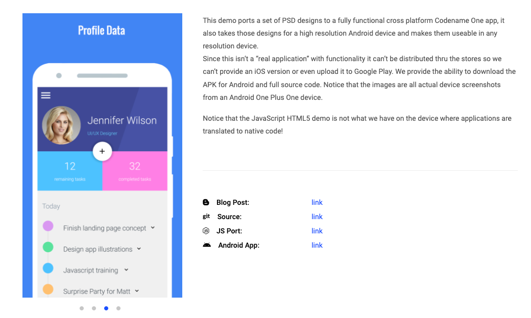 There are many other demos and templates that have been developed over the years that are not listed here. For example, there are several projects listed in the Codename One demos section of the website.