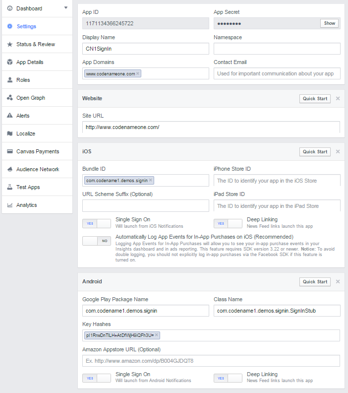 In your CodenameOne app do the following: Add facebook.appId build hint to your project properties and in your code do the following: